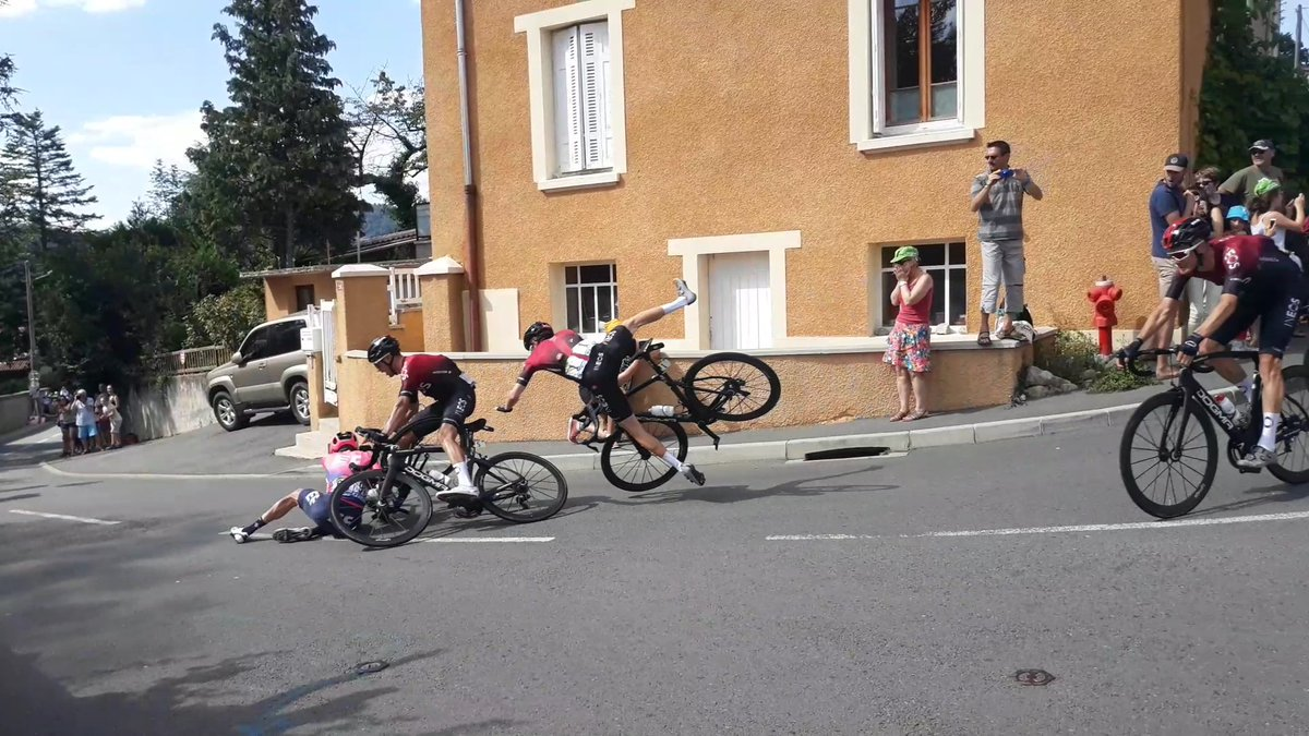 With 16 kilometers to the finish, Michael Woods (EF Education First) crashed in front of a group of Ineos riders and Thomas went down. The crash broke Gianna Moscon’s bike in half. Thomas got up very quickly and rejoined the pack after a few minutes.