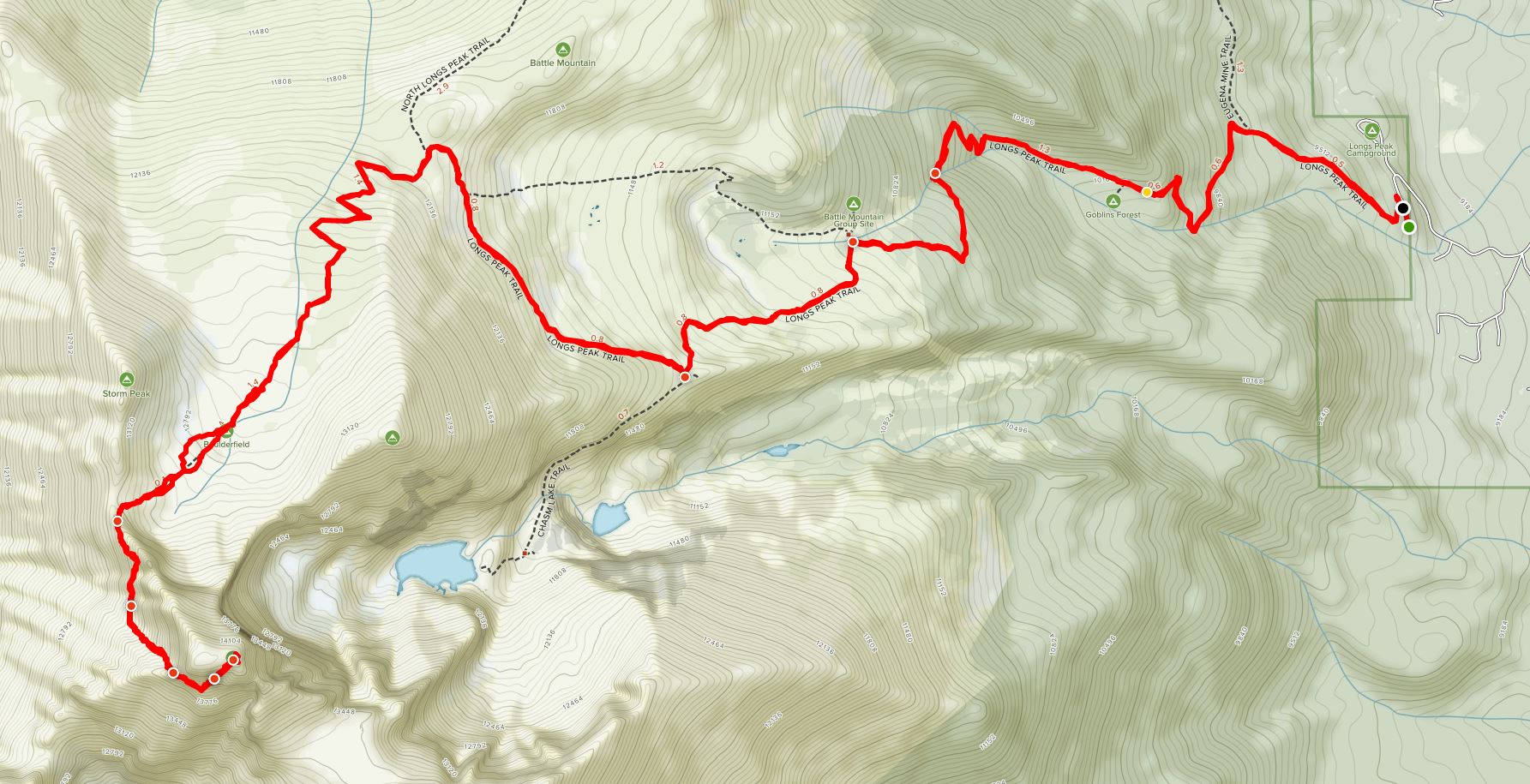 Done as a single day outing, the standard Keyhole route on Longs entails about 15 miles of hiking, 5,000 ft. of elevation gain, exposed scrambling with plenty of fall-risk potential, and a lot of difficult terrain above treeline. Much of the climbing portion of the trek is over smooth granite where storms roar in with regularity and turn the rockface into an ice rink.
