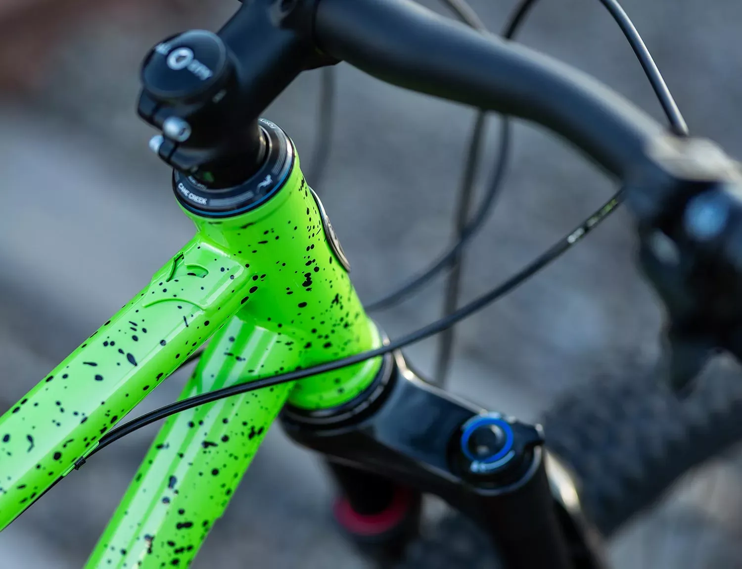 Despite its old school looks, the bike also features modern mountain standards: stealth dropper routing, BOOST spacing, thru-axles, a 44mm head tube, and two bottle mounts.