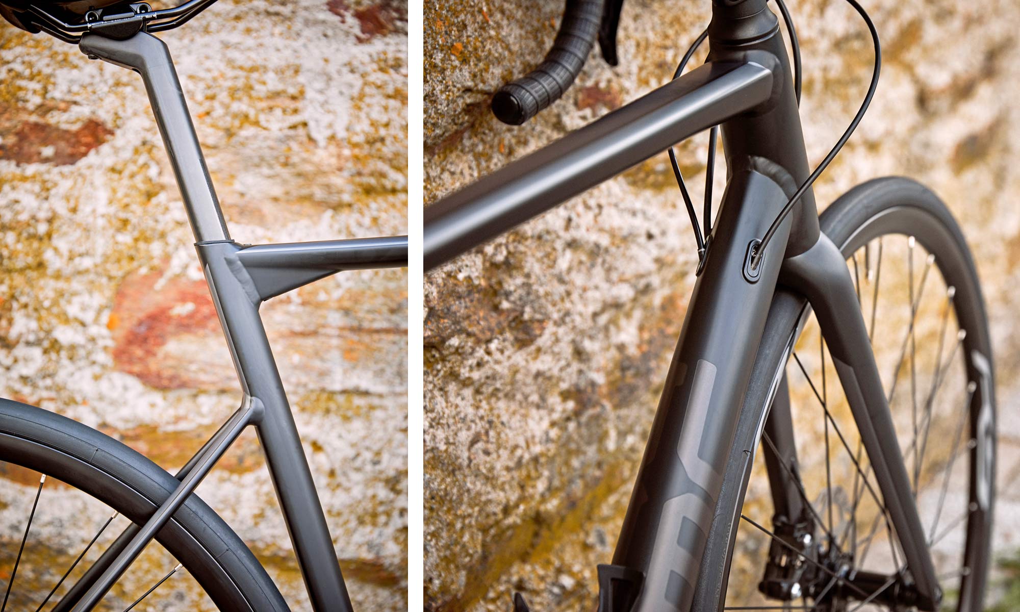 The disc brake bike includes standard flat mount calipers, 12mm thru-axles, a tapered 1.125-1.5 €³ steerer, an integrated seatclamp, and modular internal routing with alloy clamping cable ports. The rim brake version still gets the tapered steerer, integrated seatclamp and internal routing, but sticks with standard center mount rim brake calipers & quick release axles. There is enough room to fit up to 28mm wide tires on either.