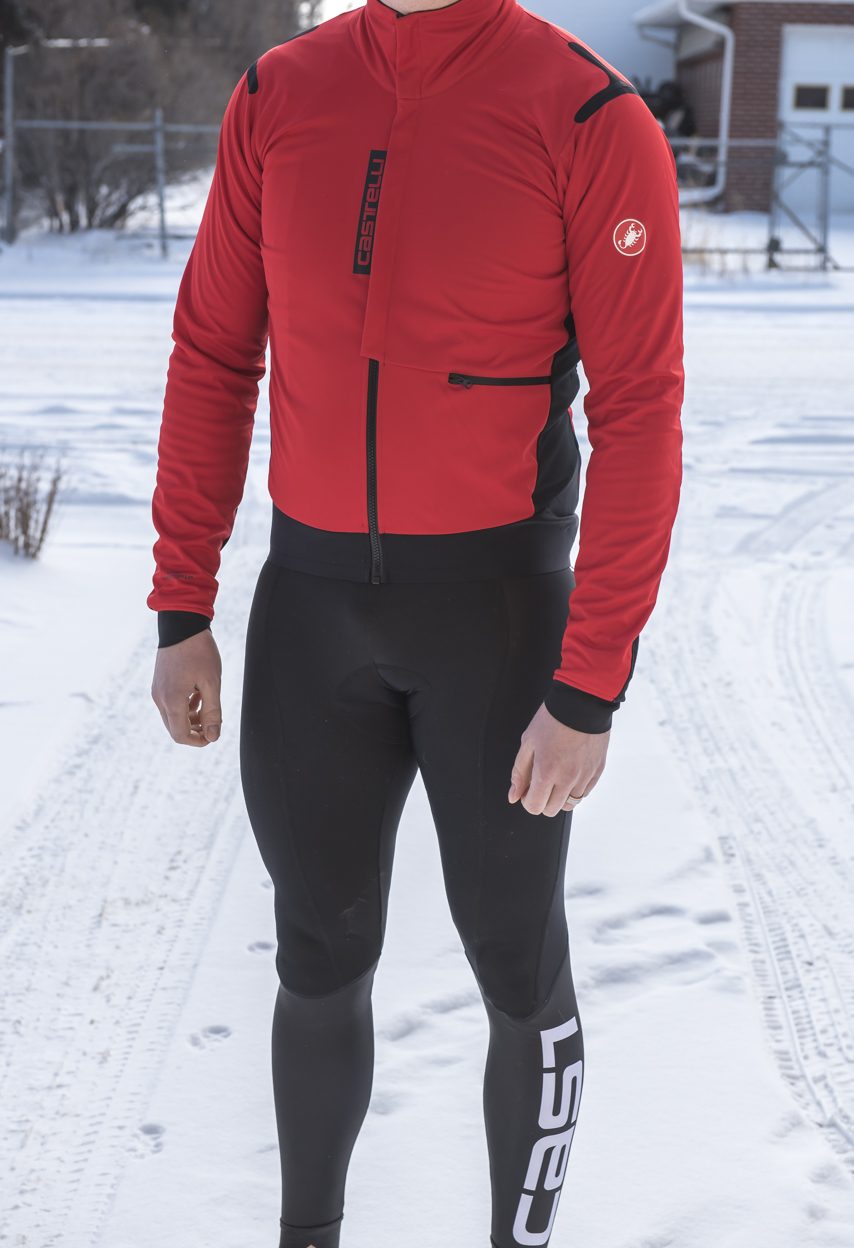 For true cold weather riding, the jacket is brilliant and feature-packed. The collar is tall and nicely articulated with a fleece backing that doesn’t irritate as you sweat. The sleeves are long and articulate with movement so you never get a dreaded glove gap. In the back the dropped tail adds some nice protection and warmth, especially when wet roads lead to spray. The Castelli-branded rubber gripped ensures it stays in place over bibs.