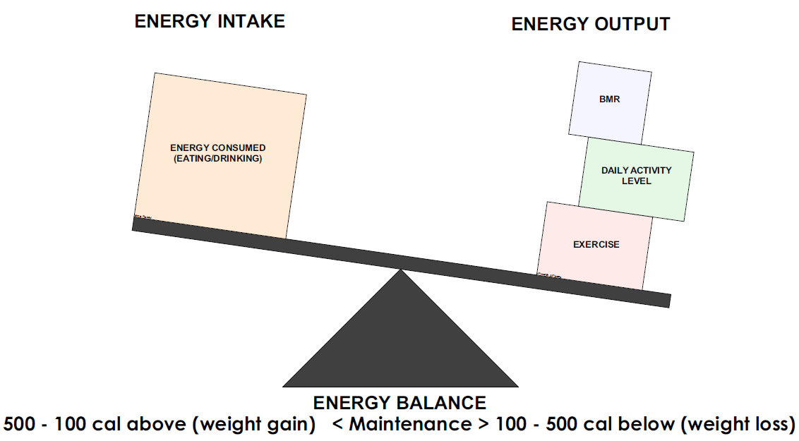 Think of your body as a car. If you want to drive your car, you have to put gas in it. Similarly, anything your body does requires energy which comes from ingested food or from reserved energy stores in the body (fat). The term “energy balance” describes the coaction of energy expenditure vs. energy input. The energy balance equation, like any system, is governed by the Laws of Thermodynamics which states that energy is neither created nor destroyed. Simply put, if you expend more calories than you take in through eating you will lose weight, physics guarantees it. A “positive energy balance” means more energy is taken in than burned, so there will be weight gain. A “negative energy balance” means that more energy is burned than taken in so there will be weight loss. If your energy balance equation is balanced equally, your weight will remain unchanged.