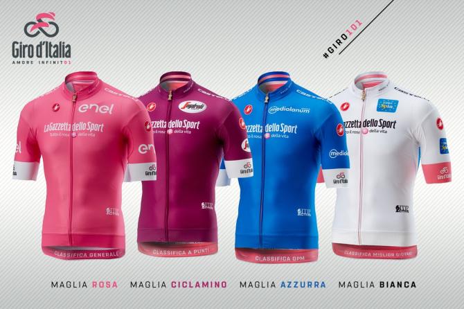 There are four jerseys in the Giro: pink, cyclamen, blue and white.