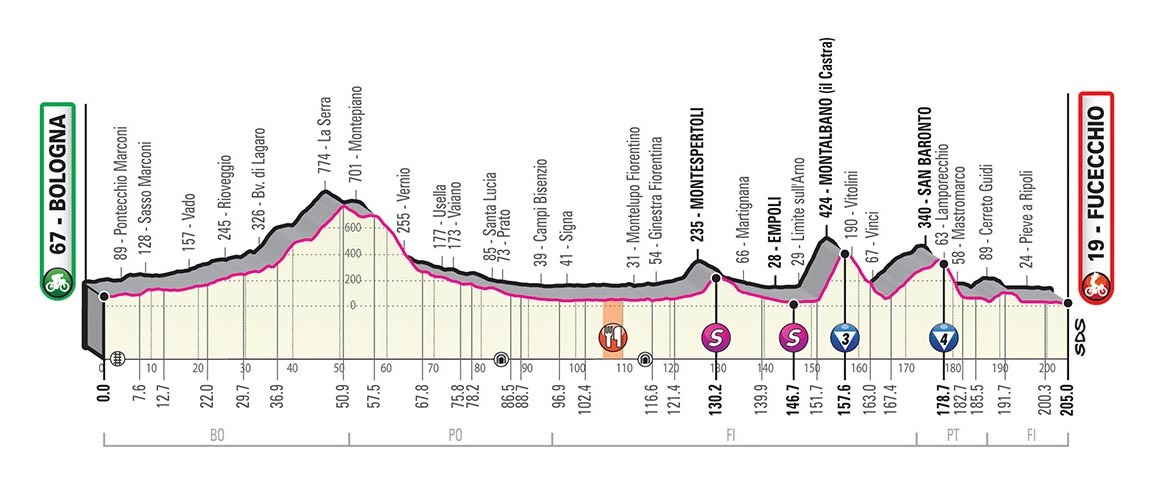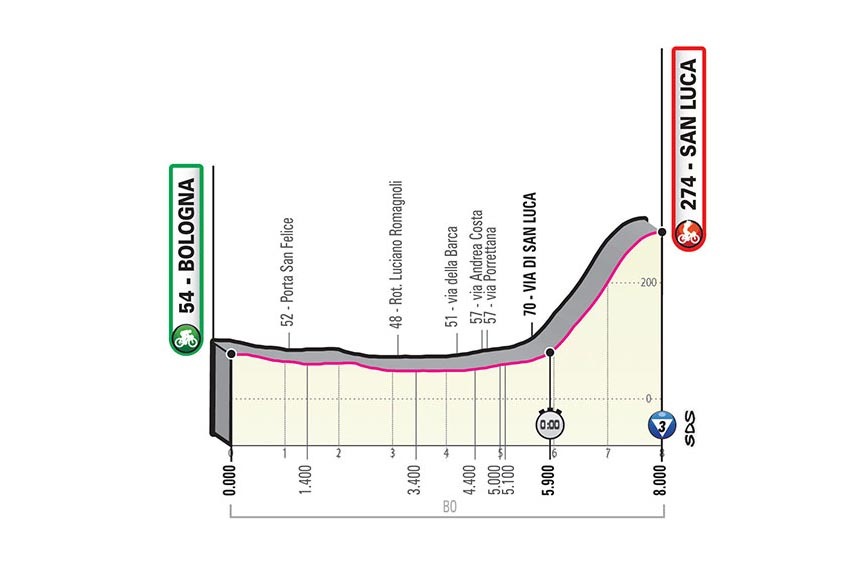 The big send off. An 8km time trial with two very distinct parts. First riders will pass through a fast section of slightly downhill streets of Bologna. Then, pure pain sets in as they power up a hill climb to the San Luca basilica, a 1.8km ascent that averages 10.8% with sections at 16%. This will be a very telling test right off the bat.