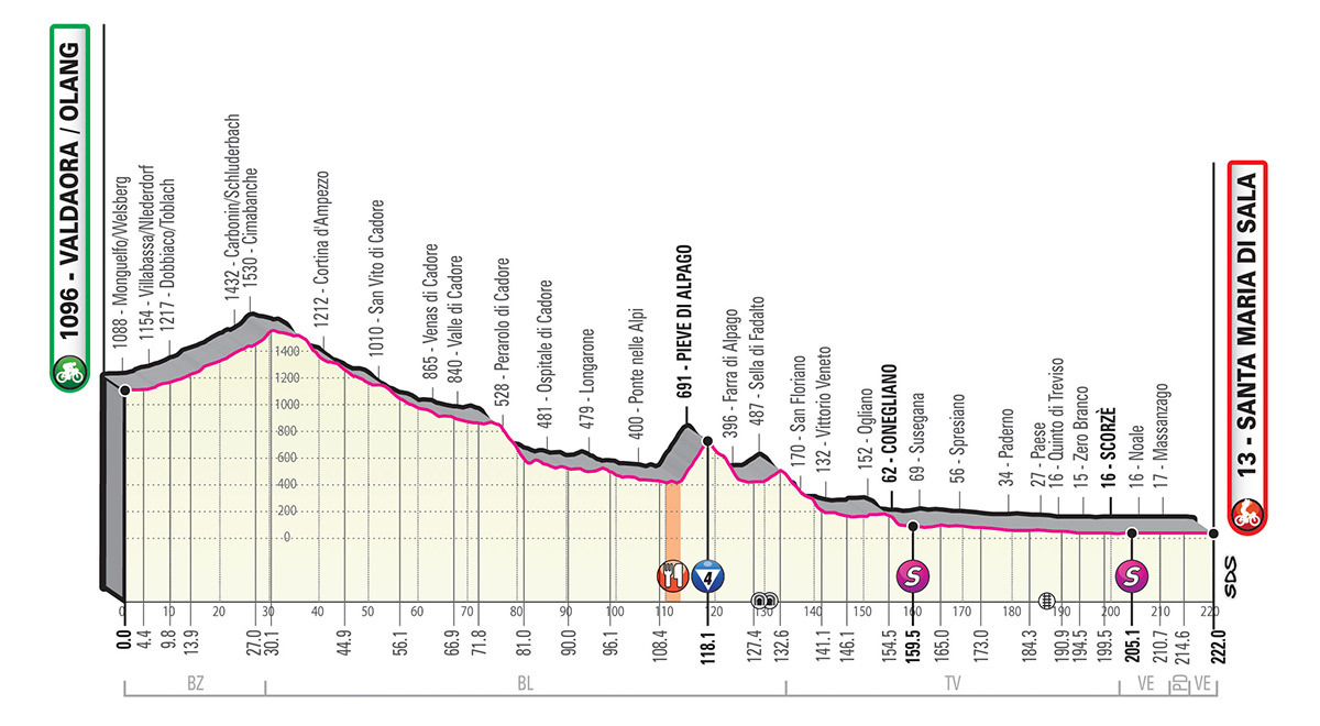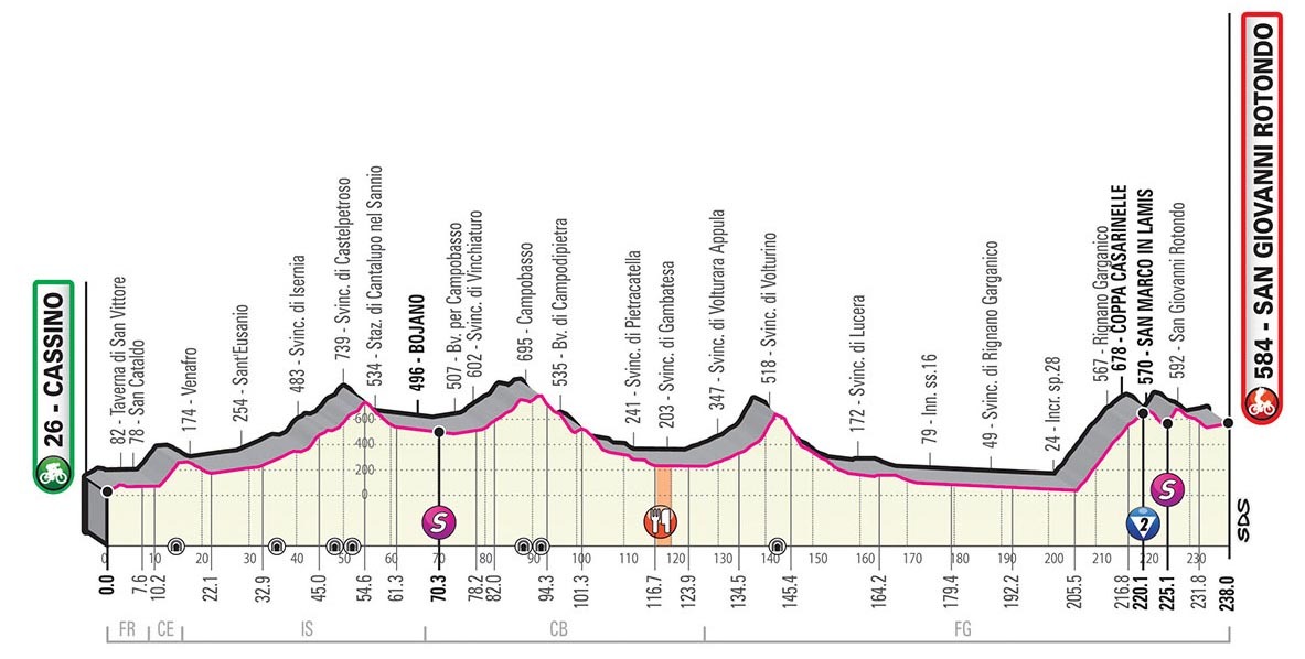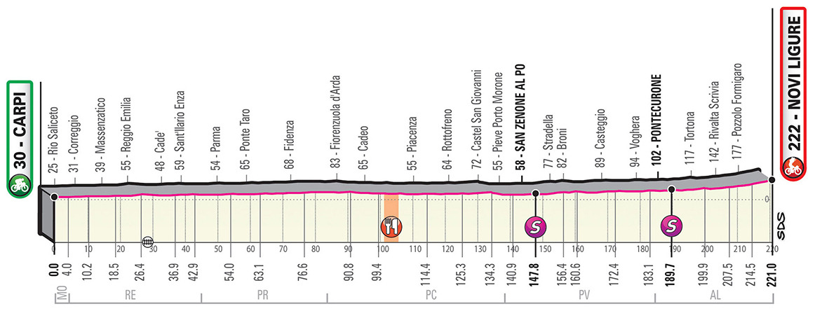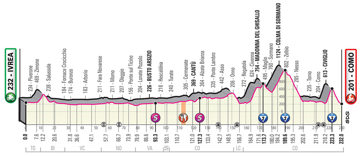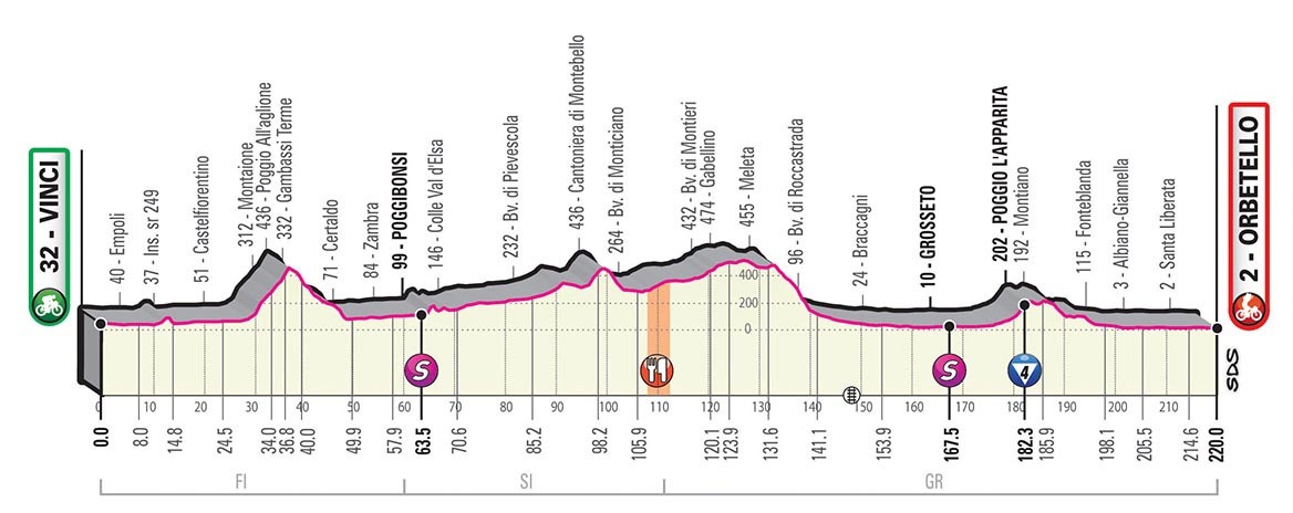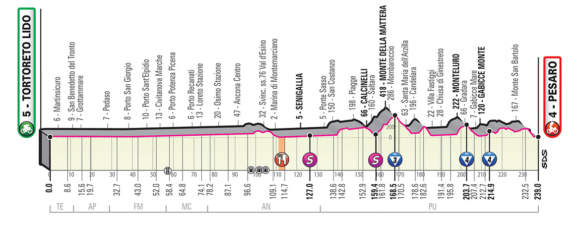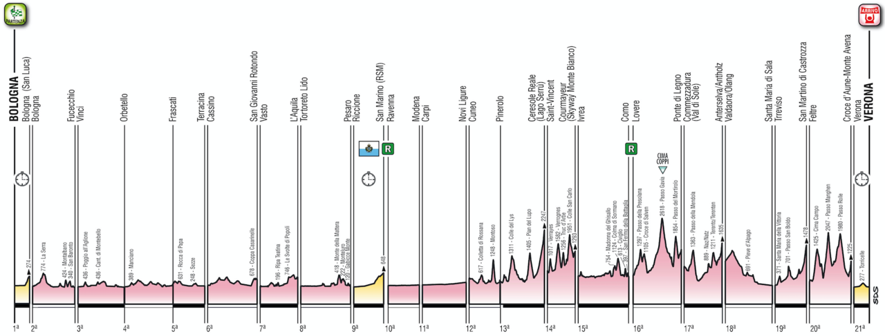 Quick note before moving on to the individual stages: TV = Traguardo Volante or Intermediate Sprint and R = Rifornimento or Feed Zone.