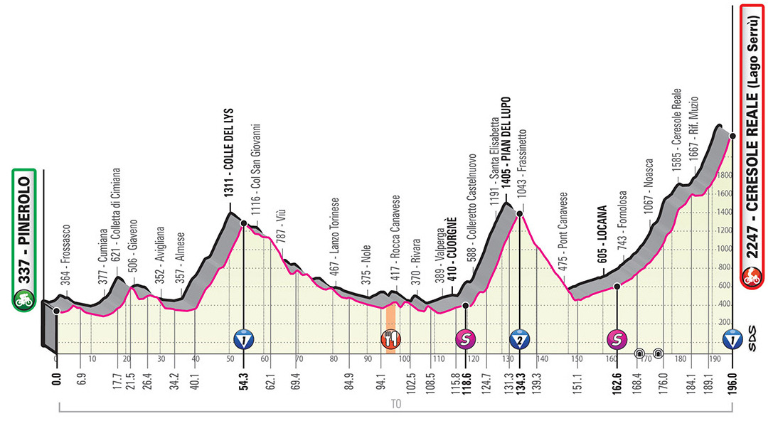 The first summit finish. The stage is played out entirely within the province of Turin. The route circles the town from the north, cresting the Colle del Lys from the most challenging side, with long stretches sloping at 9-10%. After crossing the western Canavese, the race takes a first-ever climb up Pian del Lupo (along the Santa Elisabetta side). The climb and the descent are equally harsh and demanding, with two-figure gradients over long stretches. The final climb (more than 44 km overall, including the false-flat drag) begins at the end of the descent onto Pont Canavese. The climb officially starts in Noasca, touching the sharpest gradients. In the first part, the route covers the old road, properly repaved for bicycle transit, avoiding the long tunnel (3,650 m). The route flattens out in Ceresole, near the artificial lake, then rises again over the last 10 km.