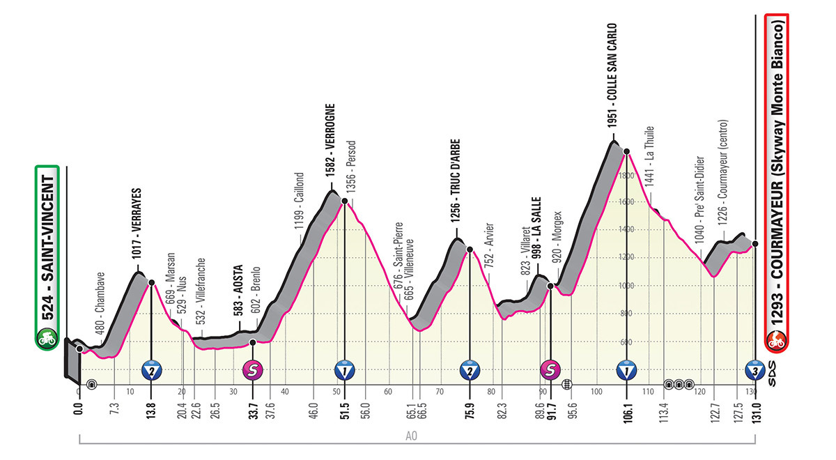 The Giro borrows from the trend to short punchy climbing stages and I love it. Stage 14 is a short and very intense high mountain stage. The only flat stretch of the stage, 14 km out of 131, is around Aosta. Otherwise, the road goes either up or down. After the Verrayes categorised climb and after crossing Aosta, the route takes in consecutive climbs to Verrogne (15 km uphill and 15 km downhill), Combes (up to Truc d’Arbe, at the intersection to Arvier), Morgex (along panoramic roads) and Colle San Carlo. The route then drops sharply to La Thuile and Pré-Saint-Didier, where the old road eventually leads to Courmayeur.