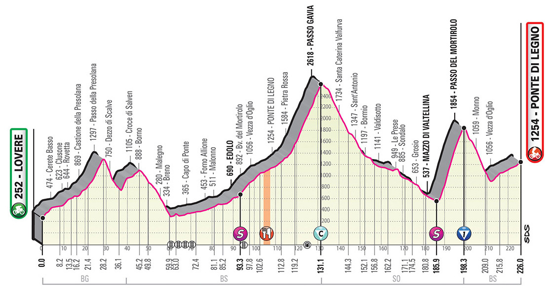 A second gigantic Alpine stage, 226 km long, and with over 5,000 m vertical altitude gain. Starting uphill from Lovere to Rovetta, the route takes in climbs to Passo della Presolana and Passo della Croce di Salven, leading to Val Camonica. After reaching Edolo, the route turns towards Passo del Tonale and takes a first pass over the finish in Ponte di Legno. After cresting Passo Gavia (2618 m – Cima Coppi) along the “traditional” side, the route drops down into Bormio and further down to Mazzo (through the upper Valtellina), clearing the Mortirolo from the “conventional” side, with max. 18% gradients. After dropping into Monno, the route goes up again with shallow average gradients (3-4%) for the final 15 km, all the way to the finish.