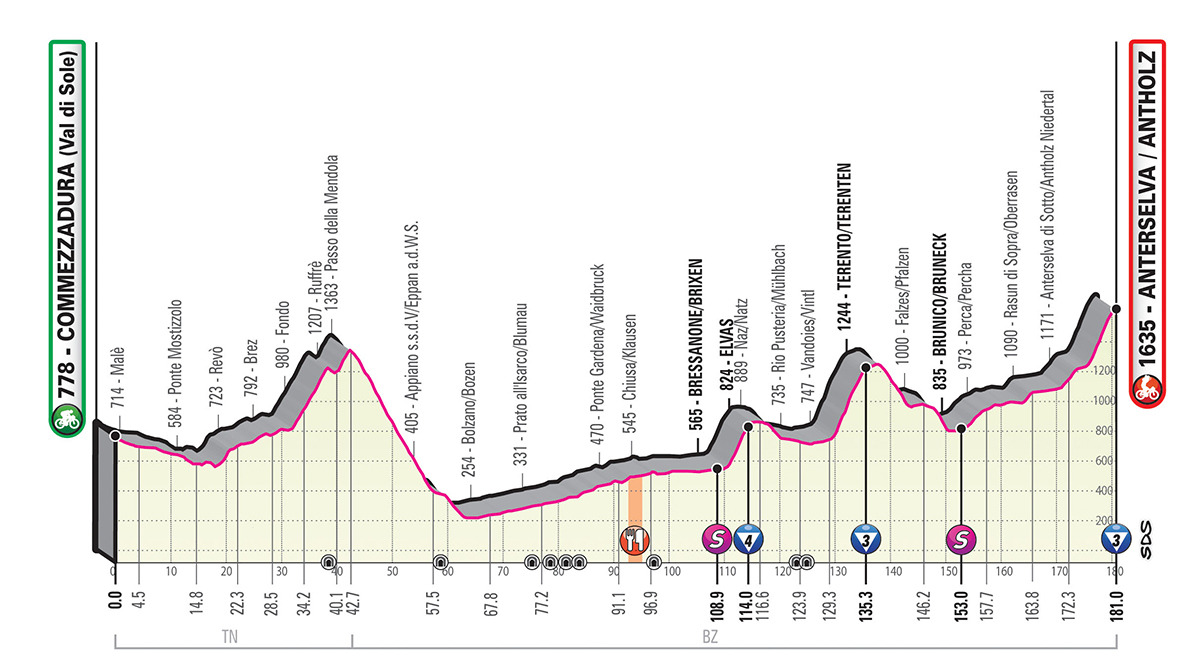 Another great day for the breakaway. The stage profile is wavy and twisting as it passes through several urban areas. The route starts downhill to the Val di Non, and takes an unprecedented climb to Passo della Mendola from the Fondo side (with steeper gradients). The course drops down into Bolzano and then climbs up the Eisack Valley, all the way to Bressanone. The riders will take in a succession of climbs and descents, with categorised summits in Elvas and Terento, leading to the foot of the final climb in Anterselva/Antholz.
