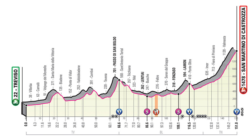 A short mountain stage with rolling undulations in the first part, as far as the Passo di San Boldo categorised climb. The closing ascent is short, yet punchy in the final kilometres, and the last 5 hairpins are inside a tunnel. The route then descends and levels out all the way to Feltre. After an uncomplicated cat. climb in Lamon, the stage travels across the Val Cismon (with a series of tunnels) as far as Fiera di Primiero, at the foot of the closing ascent.