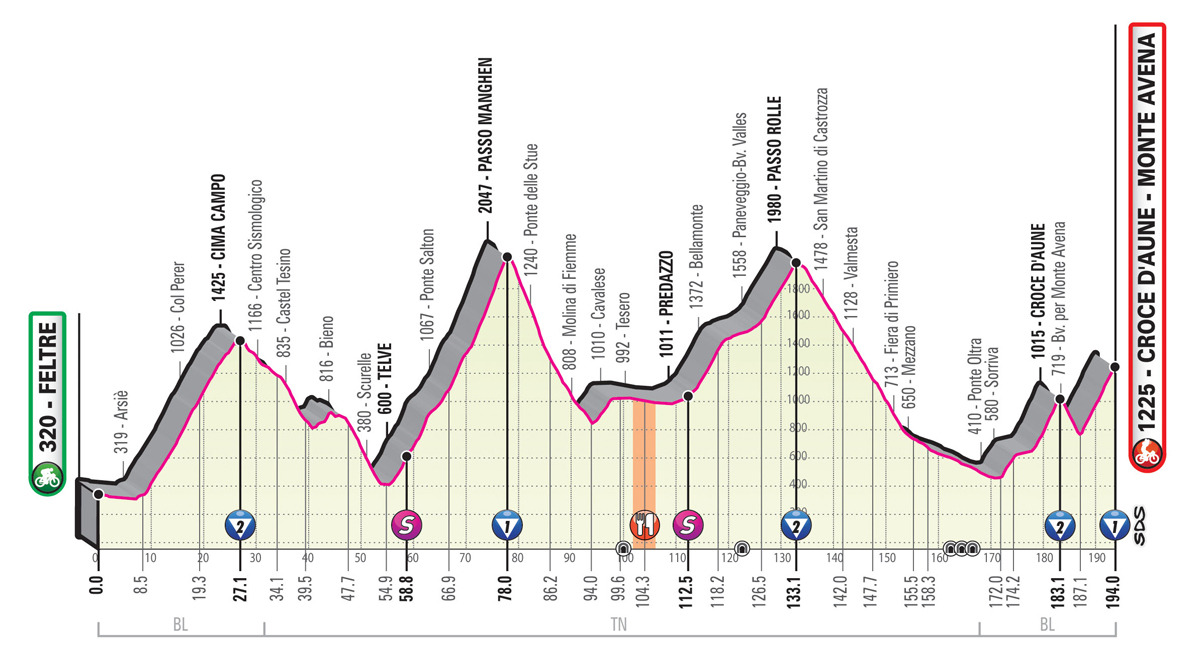 A colossal stage through the Dolomites, with 5 long consecutive climbs alternating with milder or flat stretches. Setting off in Feltre, the stage encounters the first ascents in Arsiè. After cresting the Cima Campo climb (18 km), the route descends all the way to Castel Tesino and Scurelle. Next on the route, the ascent to Passo Manghen amounts to 24 km (including both the false flat and the actual climb), with nearly 2,000 m in vertical altitude gain. A fast-running descent leads through Molina di Fiemme, Cavalese, Tesero and Predazzo, all the way to Passo Rolle. The climb, although not forbidding, is over 20 km long, and precedes the final ascent to Croce d’Aune-Monte Avena. The final part, composed of two consecutive climbs, amounts to nearly 20 km. Over the last 6 km of the Croce d’Aune climb, gradients never drop below 10%, and even top out at 16%. The route descends briefly after Croce d’Aune, and then bounces back to sharp uphill gradients over the last 7 km.