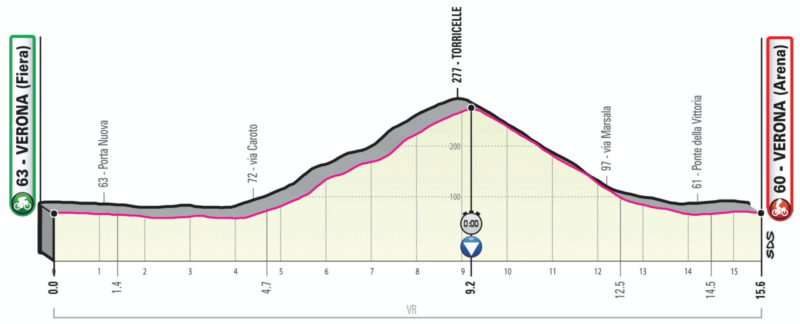 Individual time trial on the Torricelle Circuit (the same as in the World Championships), covered counter-clockwise. The first part is on broad, straight boulevards, followed by an ascent sloping for 4.5 km at 5% in a series of steps, on narrower roadway. Split time is taken at the summit, where mountain points are up for grabs. The route then descends for 4 km, still on broad and straight roads. The last 3 km along the city streets, with some sharp bends, lead all the way to the finish in Piazza Bra and the Verona Arena.