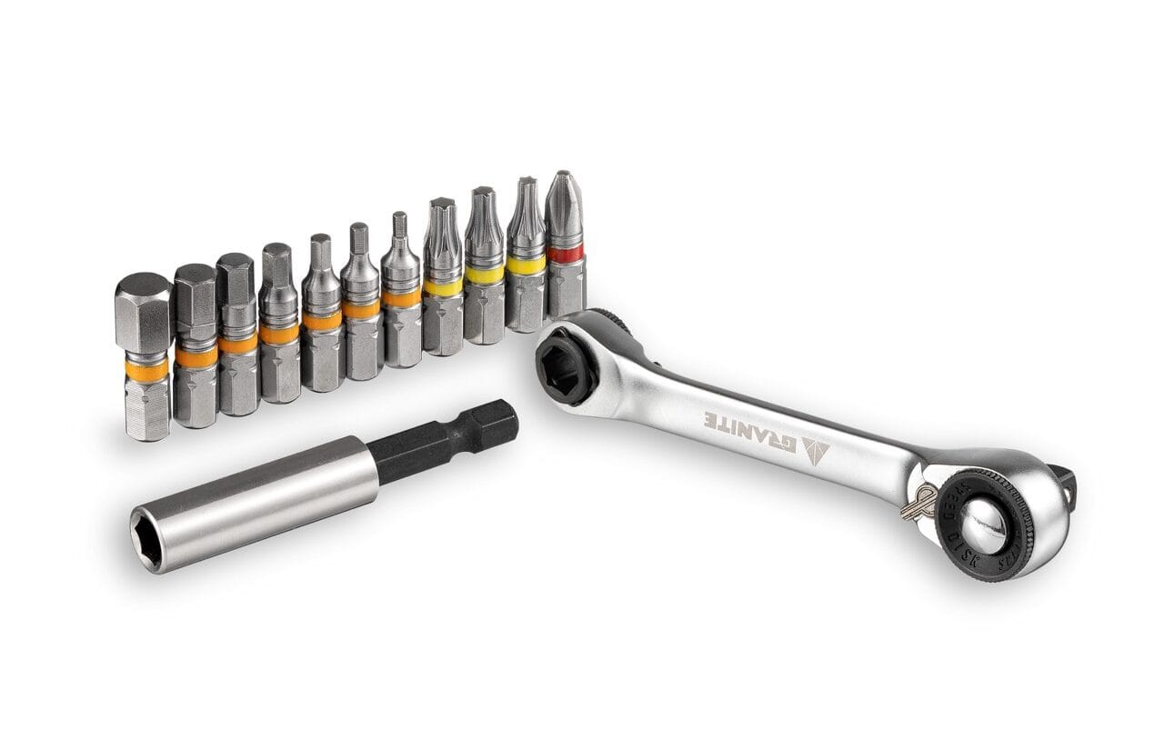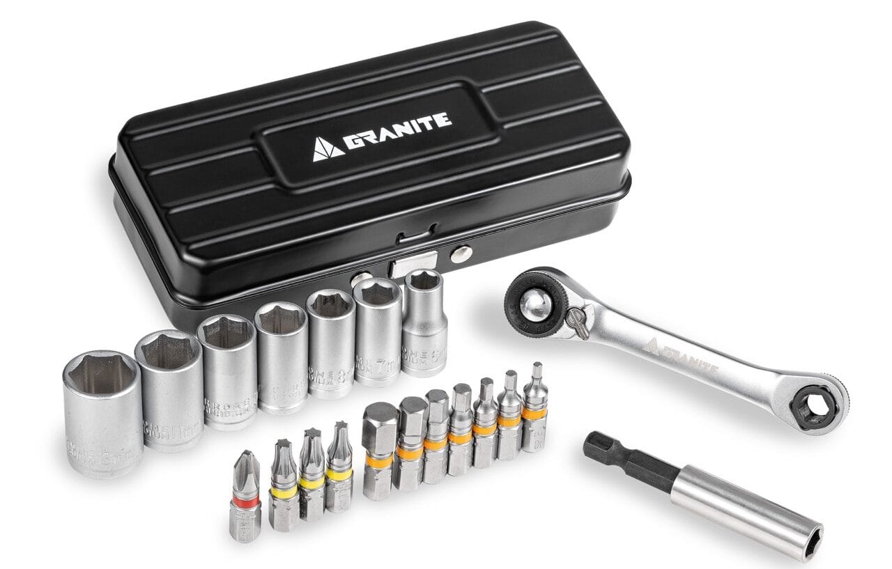 Discover the Granite Duet Tool Box with dual-head ratchet and Juicy Nipple valve caps for Schrader valves. Available July 2024. Perfect for bike maintenance!
