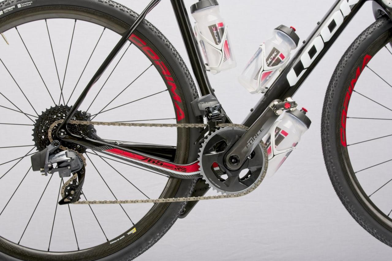 LOOK set out to make a bike fitting of the Dirty Kanza and all of it’s 200 mile of grueling terrain by building up its 765 Gravel RS frame with new SRAM Force eTAP AXS wide gearing. That gives the bike a 43/30T crankset up front and a 10-36T cassette in the back which is plenty of spread for grinding up endless hills after 9 hours in the sun. Also useful for long days on the gravel are the 765 Gravel RS’s four water bottle locations.