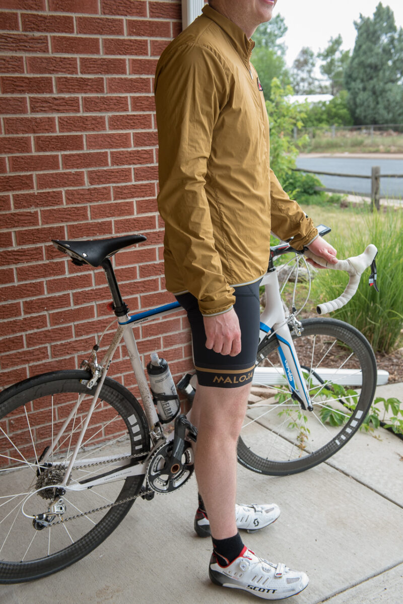First off, looks. The MaxM. jacket is probably the best looking pocket-able wind/rain cycling jacket I’ve worn. It’s incredibly simple. The colorway matches the accents of jersey and bib shorts and it is adorned only with a small Maloja patch on the chest. Finally, at the waist and cuffs is a thin line of reflective piping.