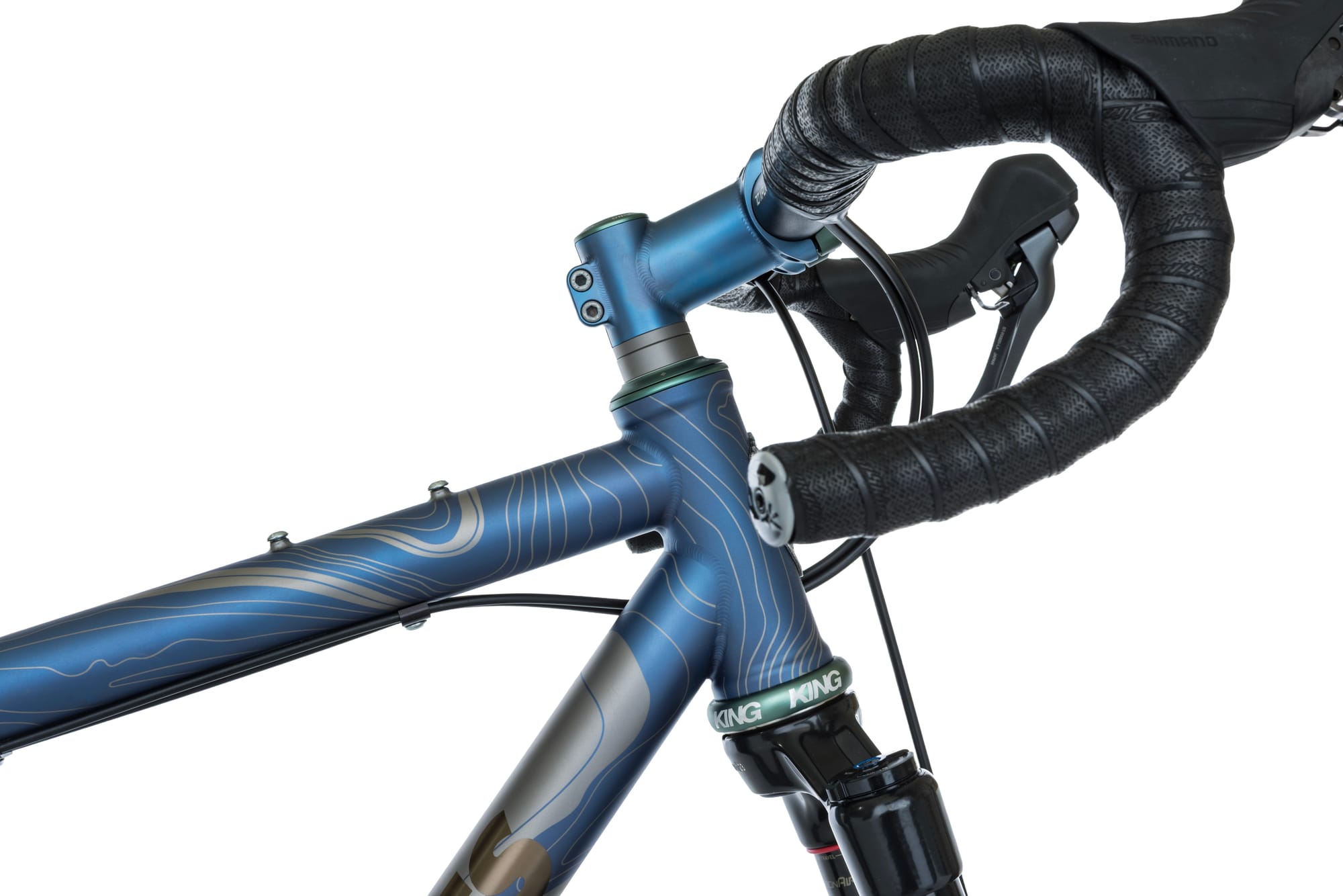 I think this is the logical end-point of the "adventure bike" category. It's not a gravel bike for racing on smooth dirt roads. It’s a "drop-bar mountain bike" purpose-built for tackling things like the Tour Divide or just disappearing for a week on rugged, unknown terrain. It’s absolutely covered in mounts: three in the front triangle, one under the down tube, a bento box mount, another mount under the top tube for a frame bag, and rear rack eyelets. It’s a cargo mule.