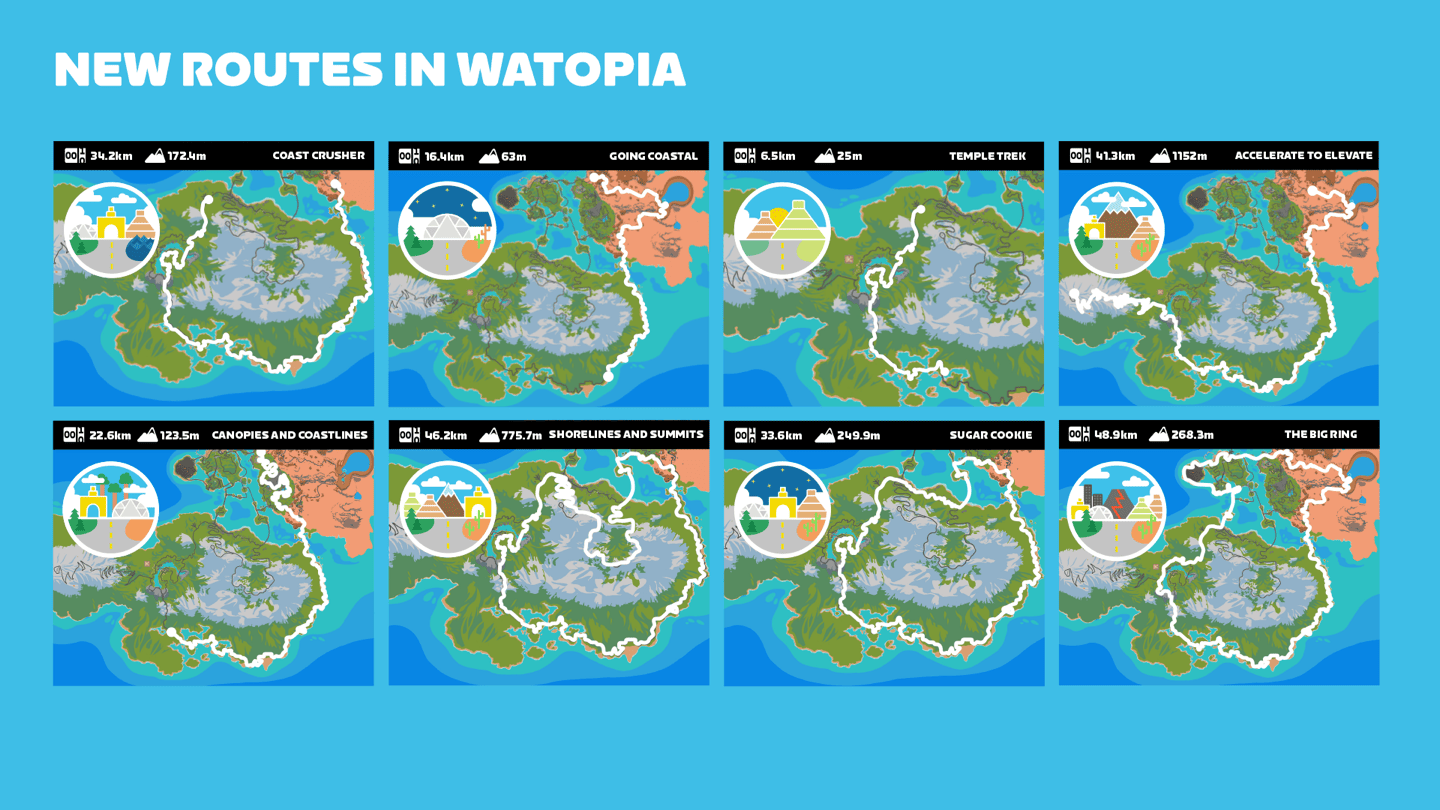 Glide past palm trees and rocky shores as you make your way from funky fishing village Googie Springs to the lush Evergreen Coast. Next up is the colorful town of Ciudad La Cumbre, followed by Sandy Coast’s Mayan-inspired vibes. The route ends back in the steamy Mayan Jungle. With four new sprint segments, you’ll find adrenaline around every turn!
