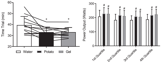 - TT performance was improved in both potato (33.0 ± 4.5 min) and gel (33.0 ± 4.2 min) groups when compared to the water group (39.5 ± 7.9 min);