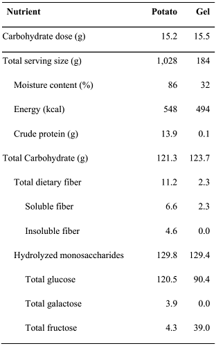 - blood glucose concentrations were higher in potato and gel groups compared to the water condition