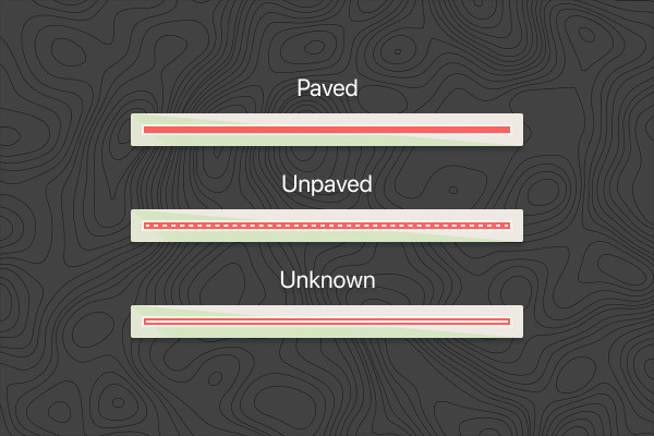 Web and mobile users will now be able to distinguish paved roads from the unpaved roads or trails while planning or viewing routes. This takes the guesswork out of route planning and ensures that you’re leaving the house prepared for what’s ahead and on the appropriate set of tires.There are three surface type categories: