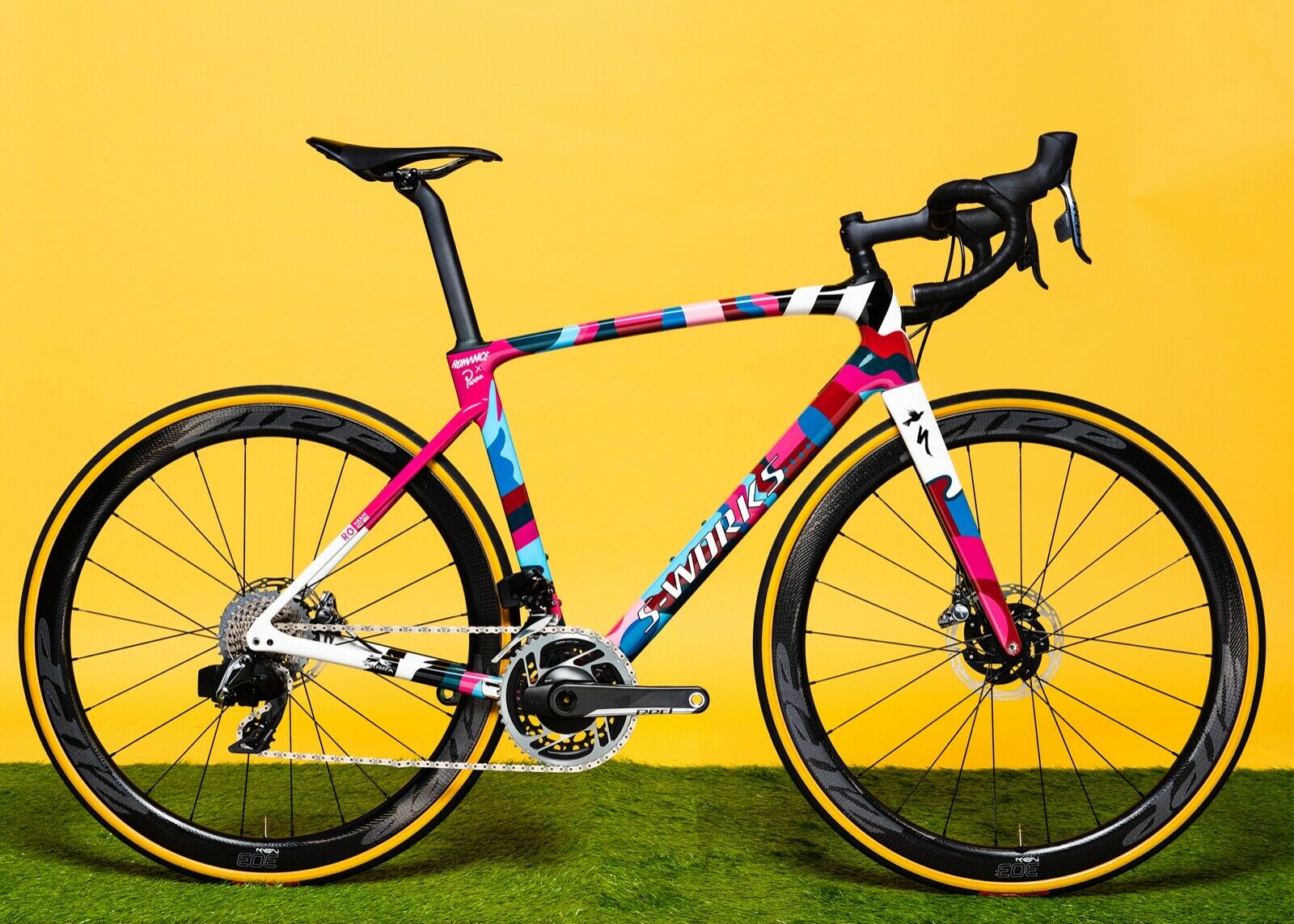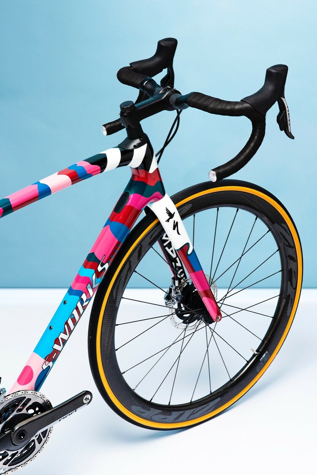 Along with the unique frame artwork from Romance X Parra, the bike is finished with a SRAM RED eTap AXS groupset, Zipp 404 NSW disc-brake wheelset and a Specialized S-Works cockpit.World Bicycle Relief