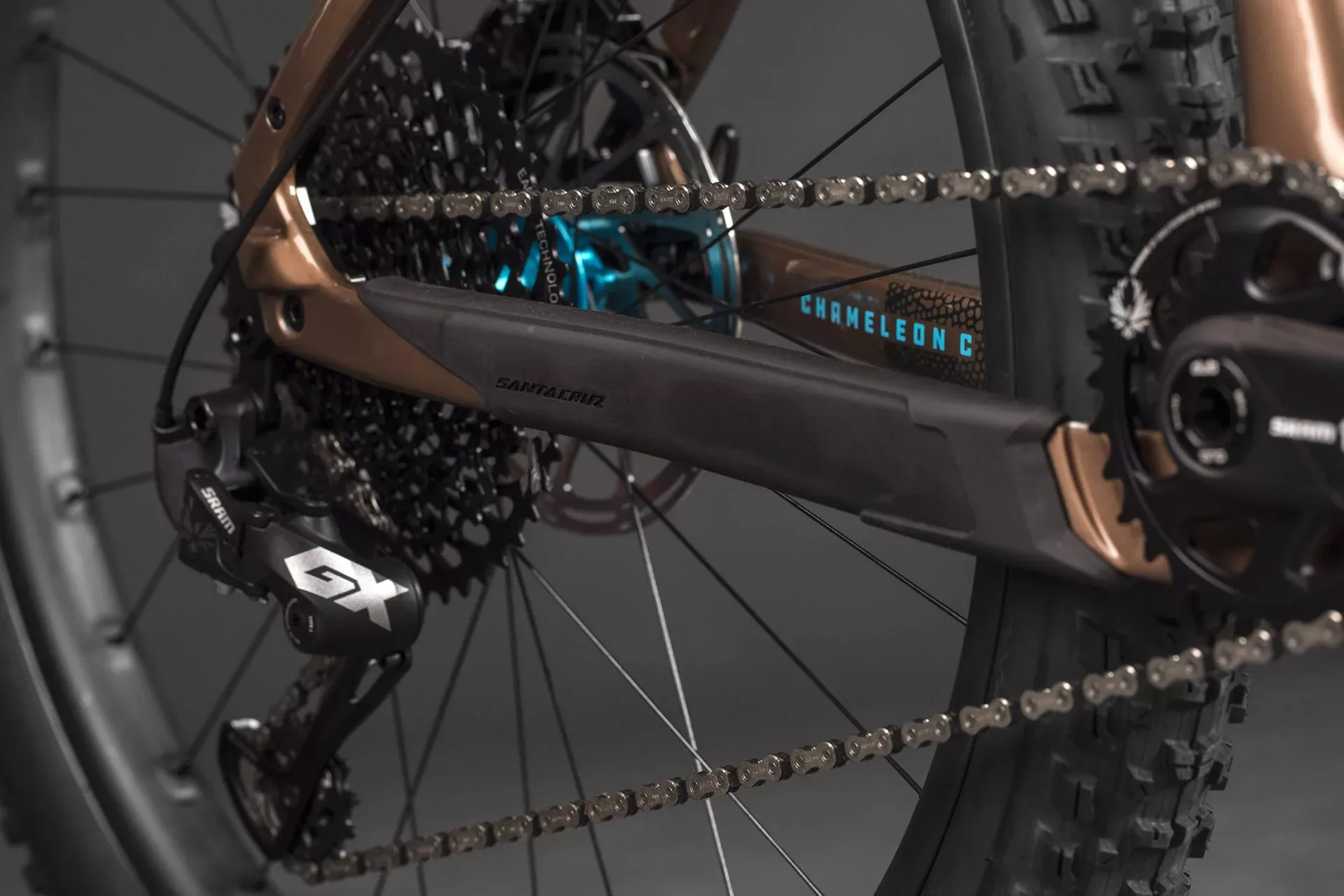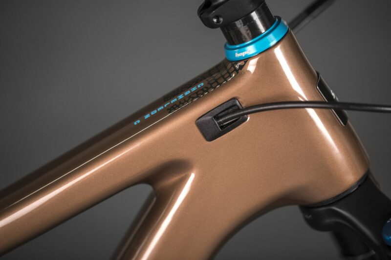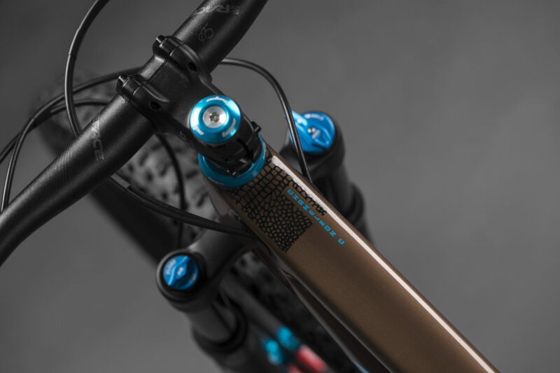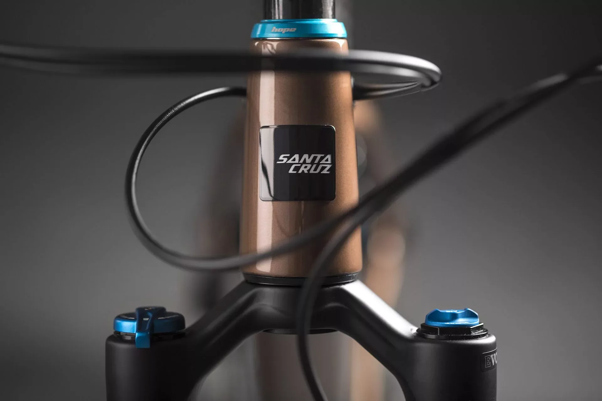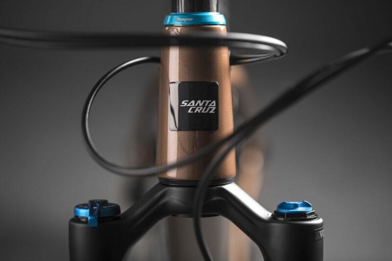Santa Cruz built the bike up with some cool pieces from Hope to deliver a colorful parts kit, complete with turquoise Hope hubs and a matching headset, they look great against the brown paint scheme.