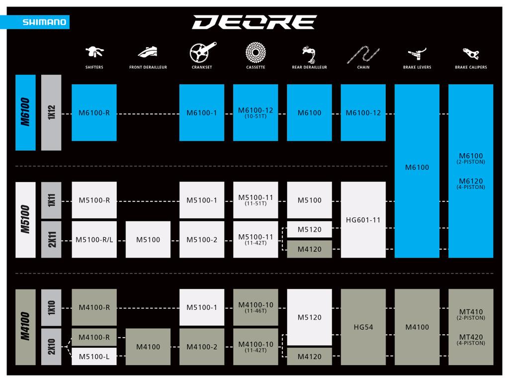 The M5100 and M4100 groupsets will be available in the coming weeks. Shimano has a great easy to read compatibility chart for building your dream bike:
