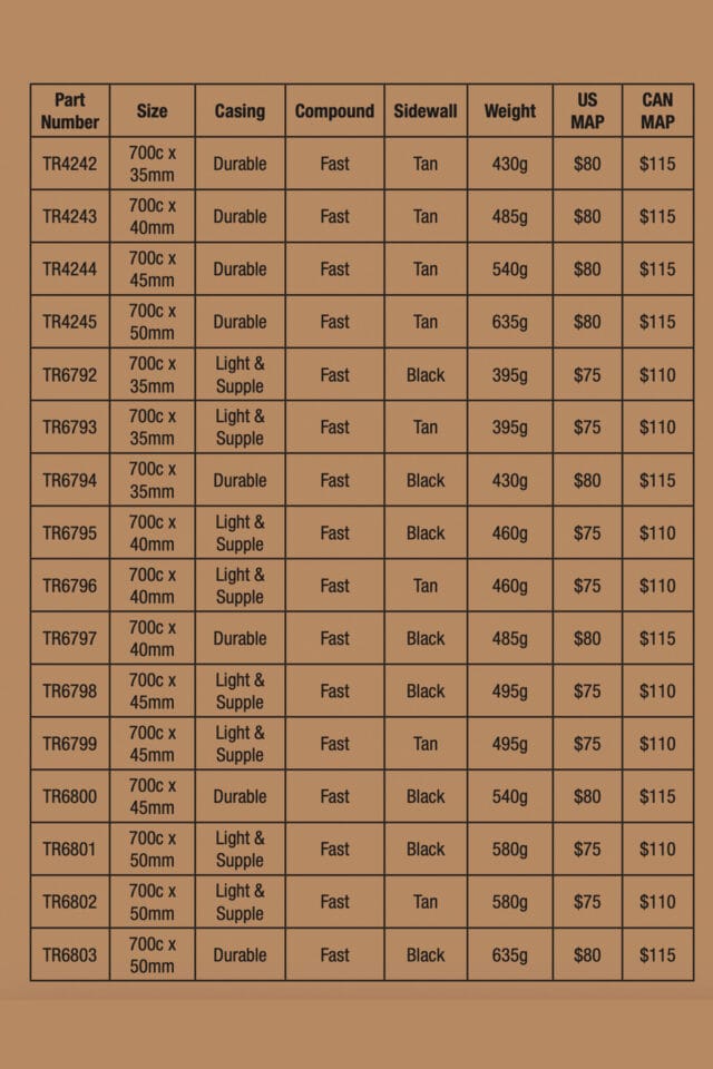 The Updraft is available in a wide range of sizes (700 x 35mm, 40mm, 45mm, and 50mm) and comes in both black and tan wall casings. Weights range from 395g (700 x 35mm Light & Supple) to 635g (700 x 50mm Durable). Prices are $75 USD for the Light & Supple models and $80 USD for the Durable versions.