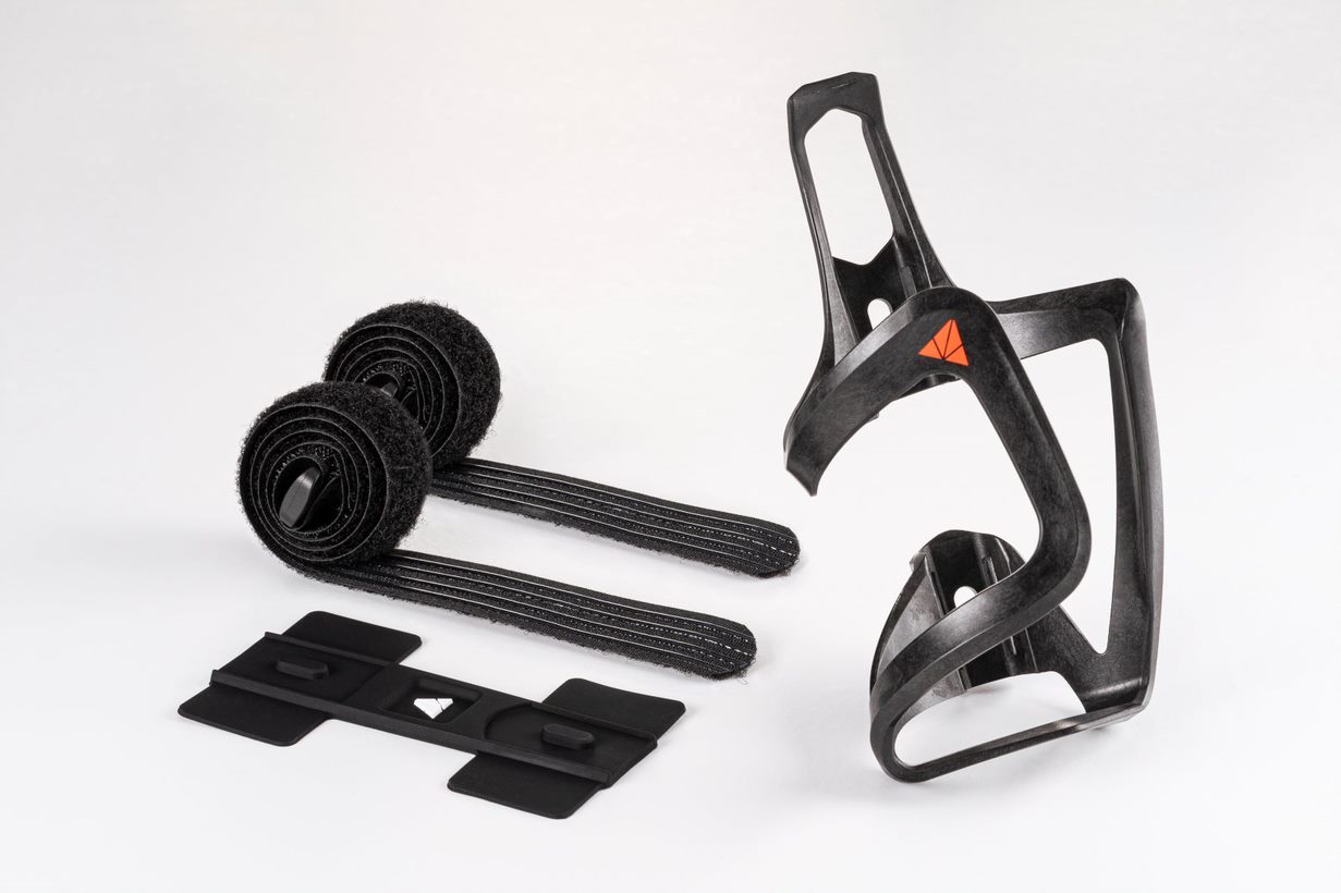 The AUX kit includes a lightweight, side-loading cage that’s designed to work with tight-fit frames and is made from super-tough carbon fiber reinforced thermoplastics with a stealthy matt finish. The Aux Strap Kit includes everything you need to attach the cage to almost any bike frame in almost any location. The Kit uses silicone coated hook-and-loop straps and grippy rubber pads for a rock-solid fit that won’t leave your bottle on the trails.