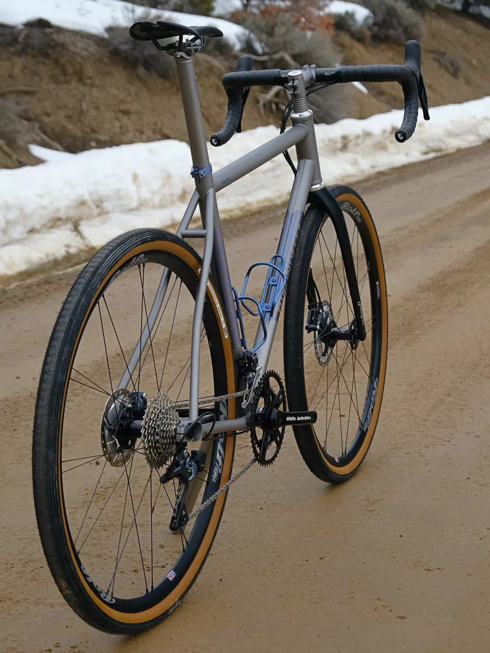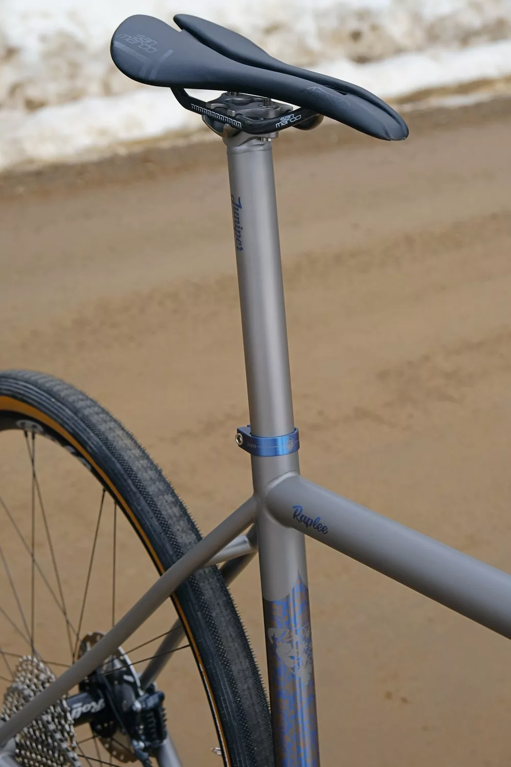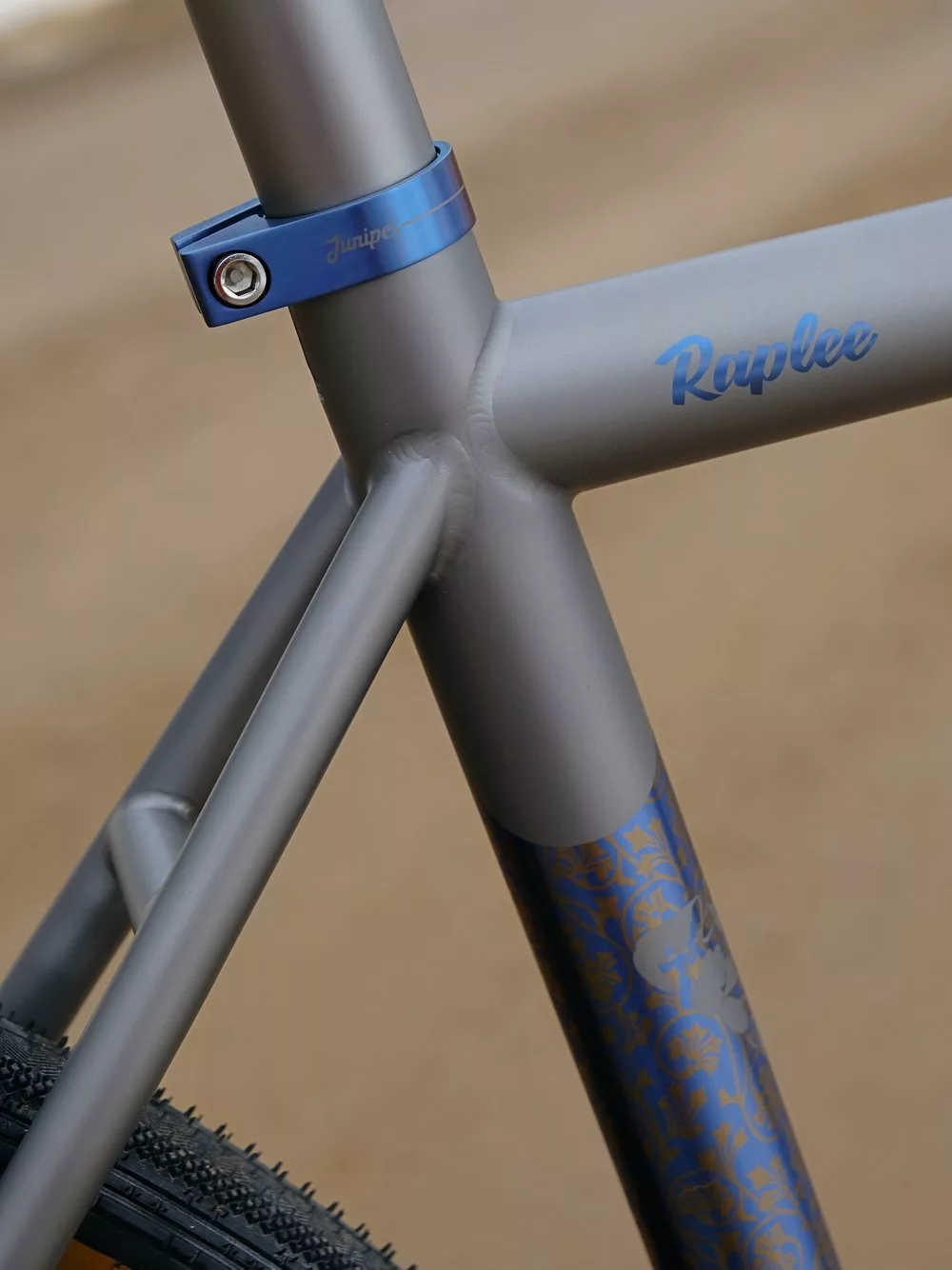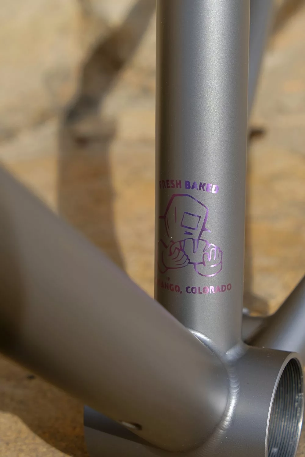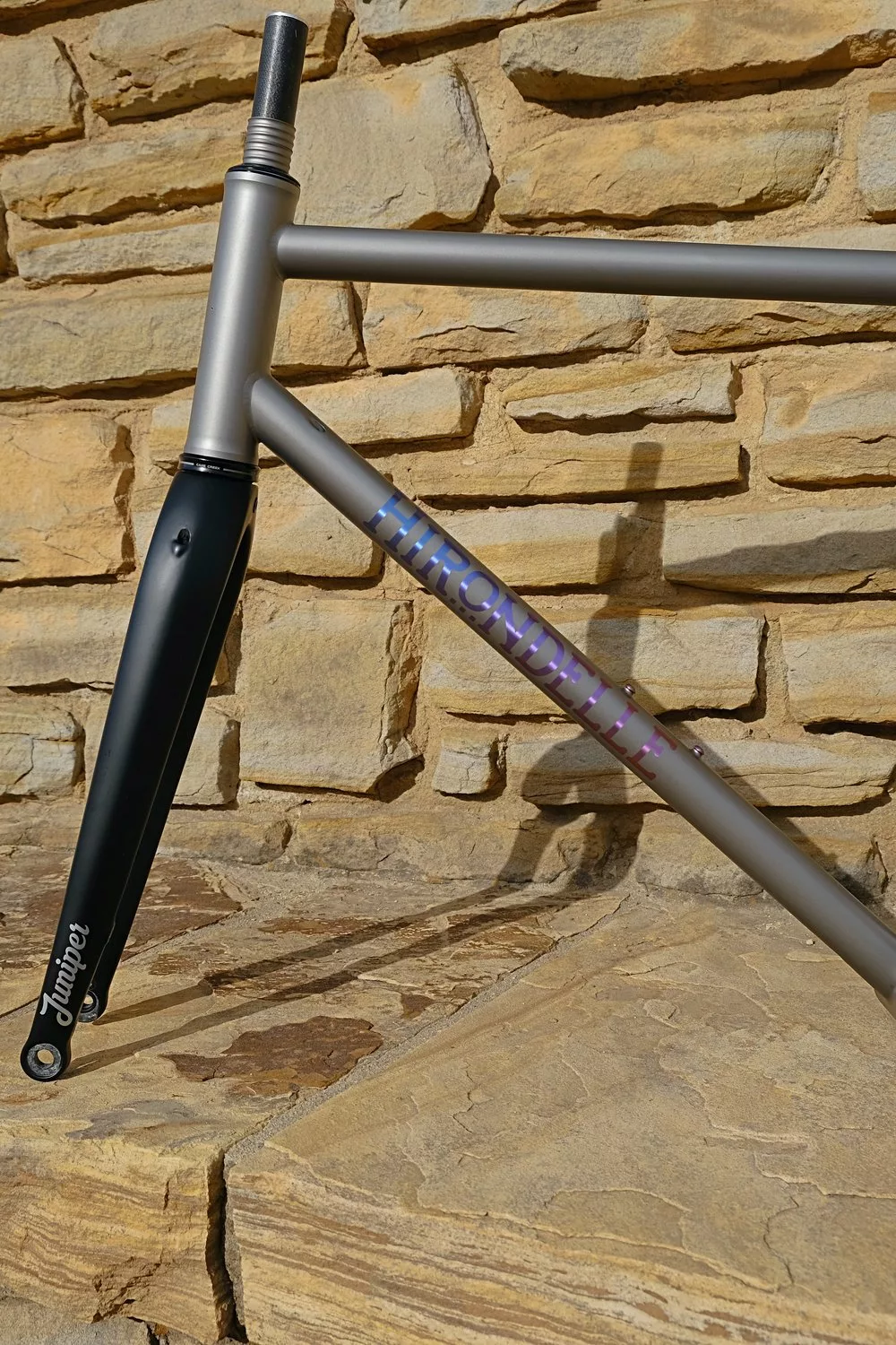 Frames come standard with a single color anodized graphics (a range of options are available), a color matched Juniper seat collar, color matched ti bolts, a silver White Industries headset, and a Juniper carbon gravel fork. If Juniper ti components are purchased with the frame, they’ll come with highlights matched to the anodized color of your frame. Internal routing available at no extra charge. Rack and fender mounts, bento box and Manything cage bosses, and dropper routing are available options. Anodized finishes are done by Agave Finishworks - premium finish options are available, as well as color fades, marbling, and splatter ano. Bearclaw titanium fork upgrade available (+$540). The fork will be finished in a satin base texture to match the frame, with matched anodized logos. Suspension corrected geometry for Fox Float AX and RockShox Rudy is available, please contact for pricing and availability on suspension fork substitutions.
