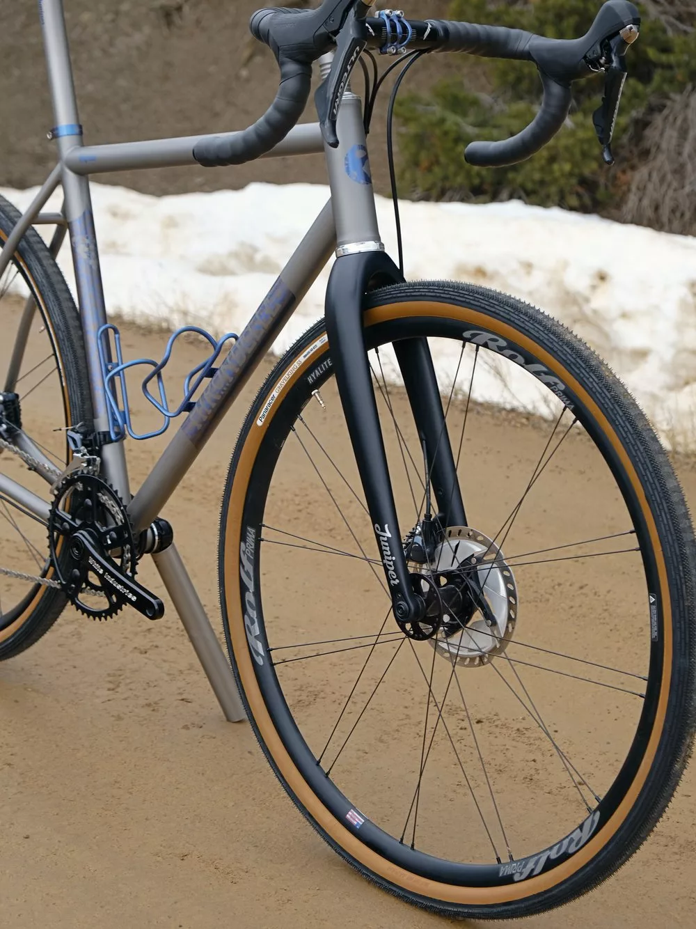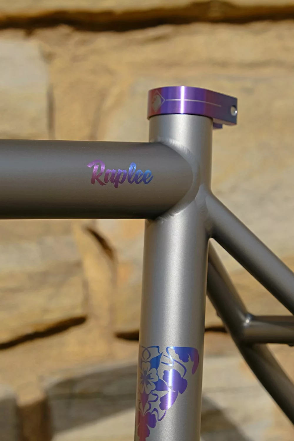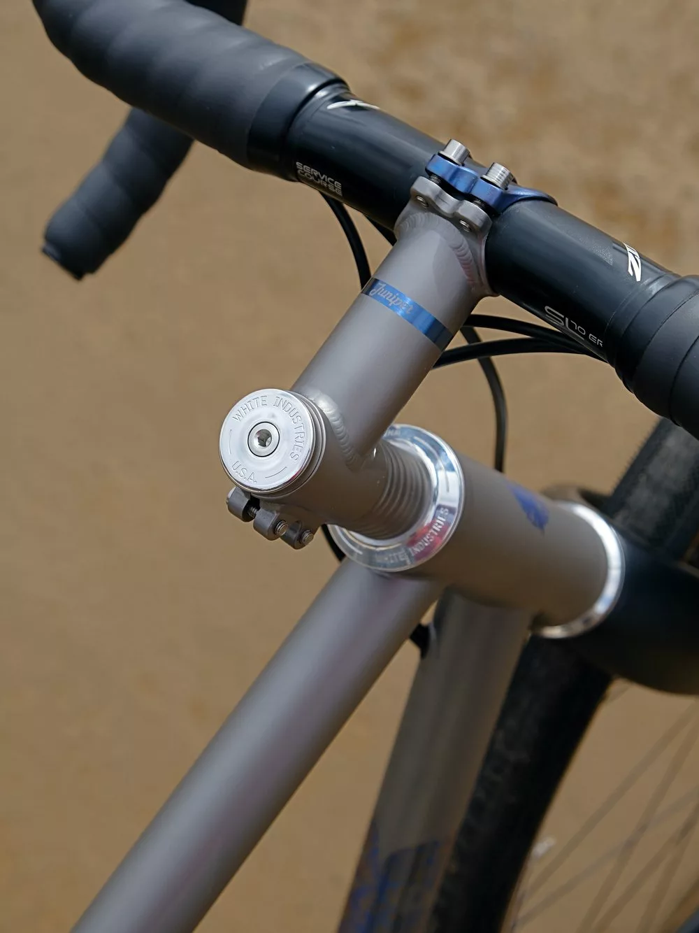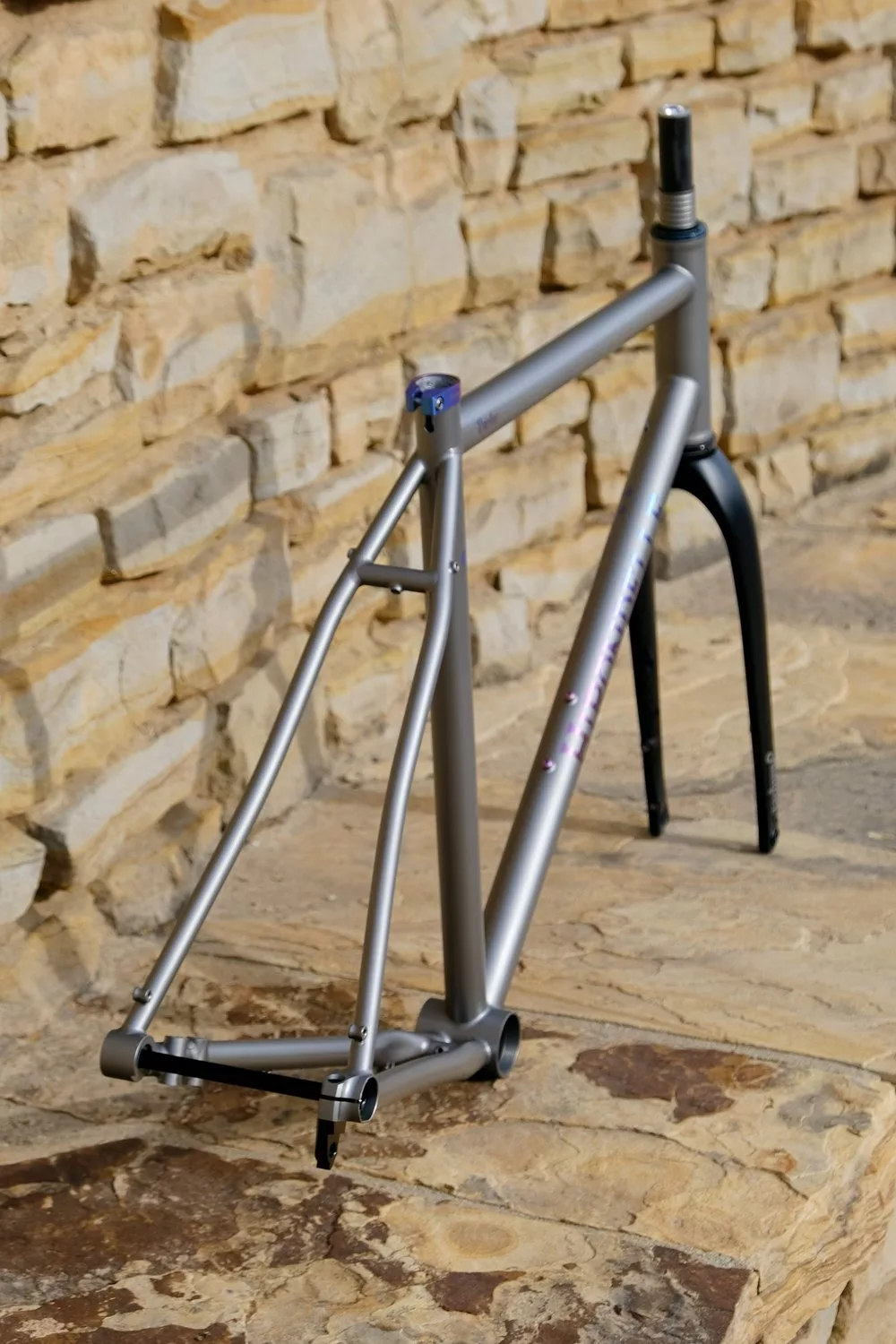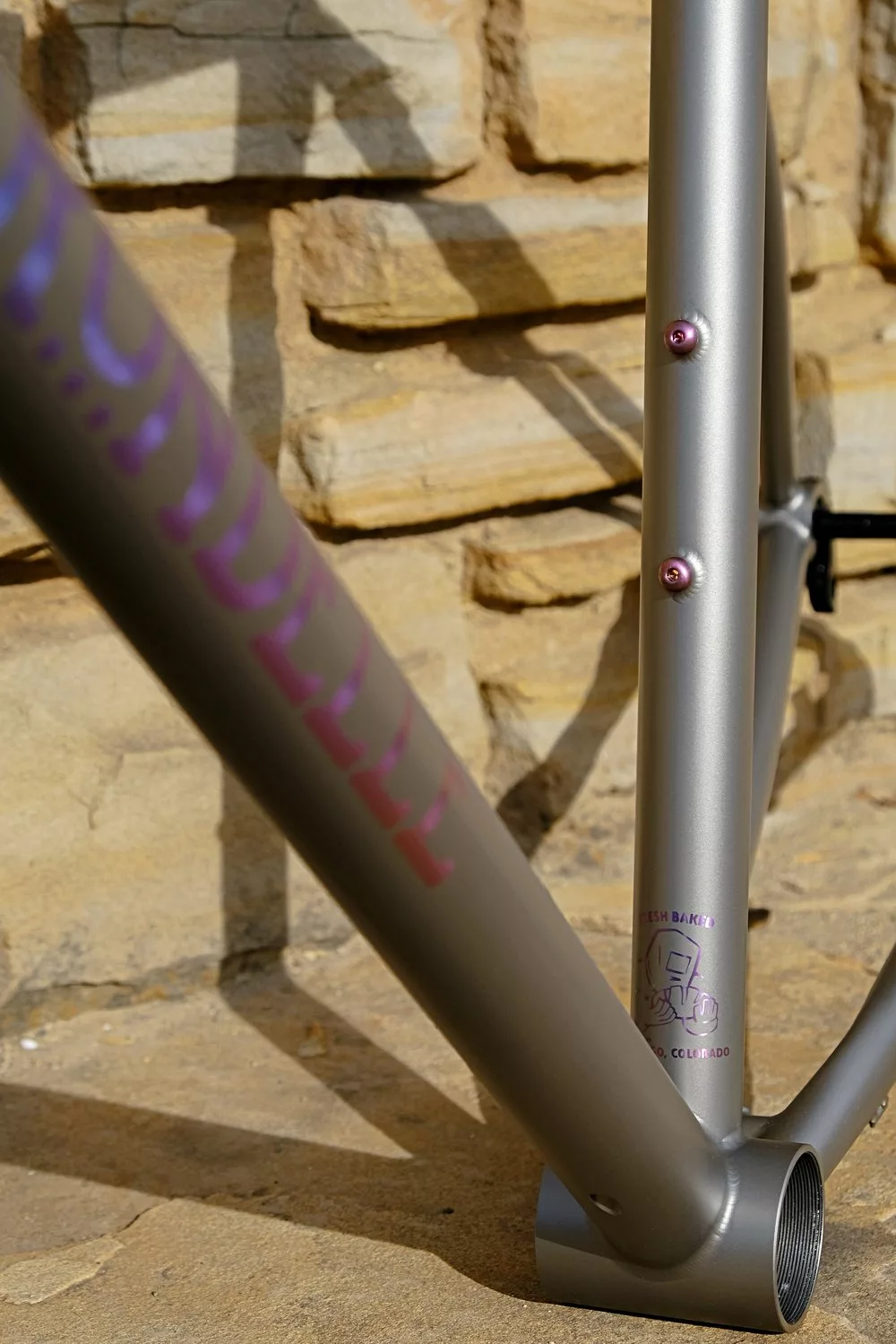 Frames come standard with a single color anodized graphics (a range of options are available), a color matched Juniper seat collar, color matched ti bolts, a silver White Industries headset, and a Juniper carbon gravel fork. If Juniper ti components are purchased with the frame, they’ll come with highlights matched to the anodized color of your frame. Internal routing available at no extra charge. Rack and fender mounts, bento box and Manything cage bosses, and dropper routing are available options. Anodized finishes are done by Agave Finishworks - premium finish options are available, as well as color fades, marbling, and splatter ano. Bearclaw titanium fork upgrade available (+$540). The fork will be finished in a satin base texture to match the frame, with matched anodized logos. Suspension corrected geometry for Fox Float AX and RockShox Rudy is available, please contact for pricing and availability on suspension fork substitutions.