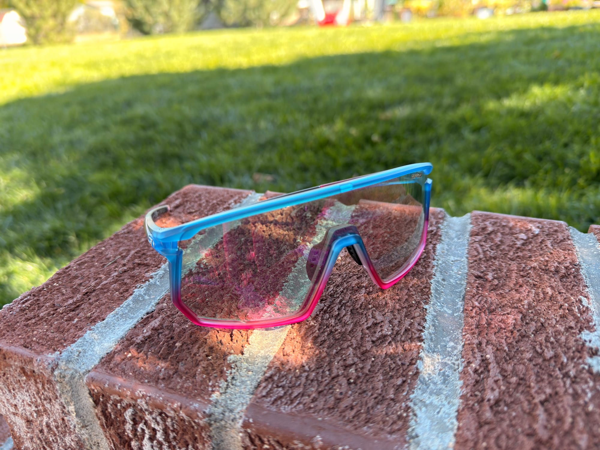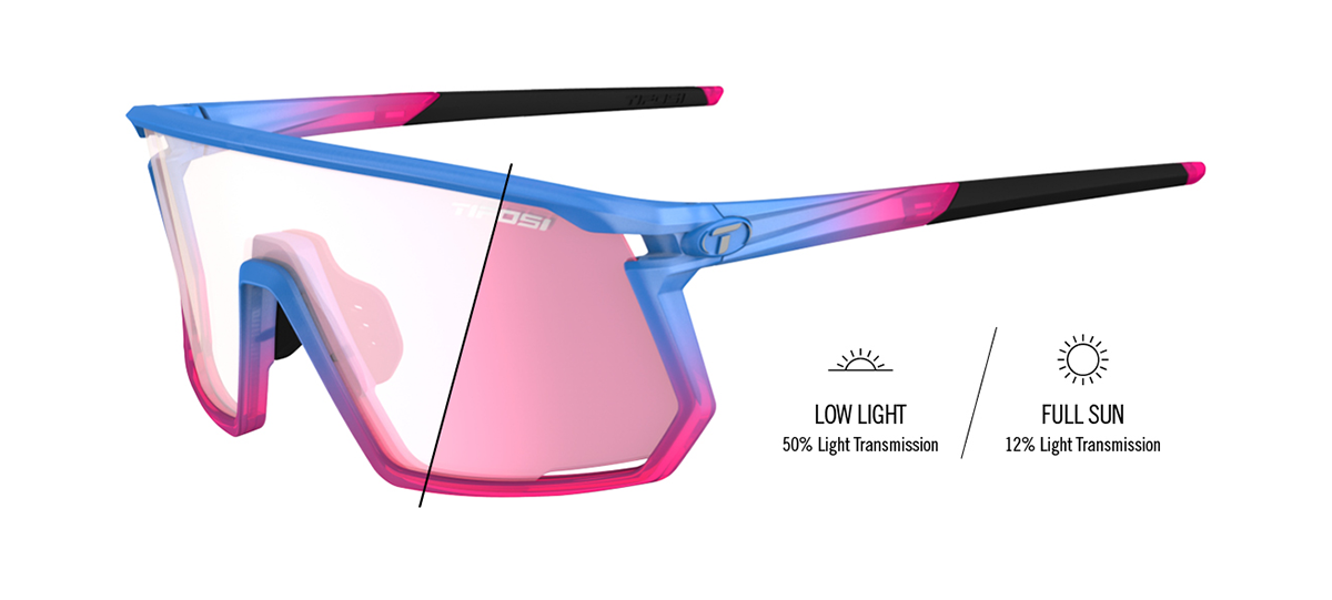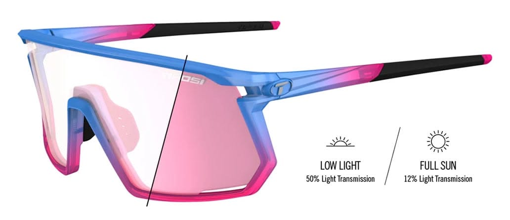 What truly sets this special edition apart is the lens technology. The Cobalt Bloom frame is paired with Tifosi’s Clarion Pink Fototec lenses. "Fototec" is Tifosi's term for photochromic technology, meaning the lenses adapt to changing light conditions. They transition from a nearly clear state with 50% visible light transmission (VLT) in low light to a dark, reflective pink with just 12% VLT in bright sun.