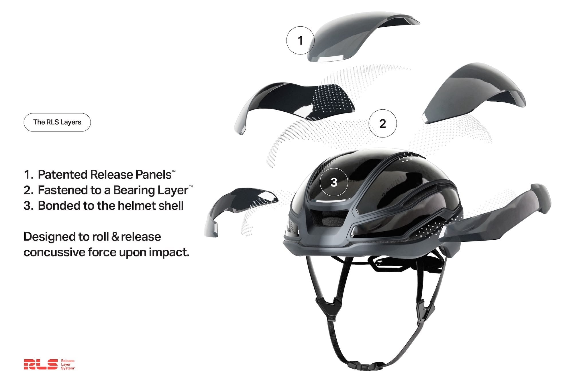 RLS is a patented technology that takes a novel, outside-in approach to managing rotational impacts. Unlike internal slip-liners, RLS integrates its safety system into the helmet's exterior. It consists of external shell panels that are mounted onto the helmet's main body using a layer of small polycarbonate bearings.