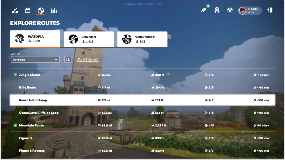 The route selection menu has also been redesigned. Routes are now assigned a difficulty level based on distance and elevation and expected time to complete. You can also sort the routes on the page by name, duration, elevation, name, or difficulty.